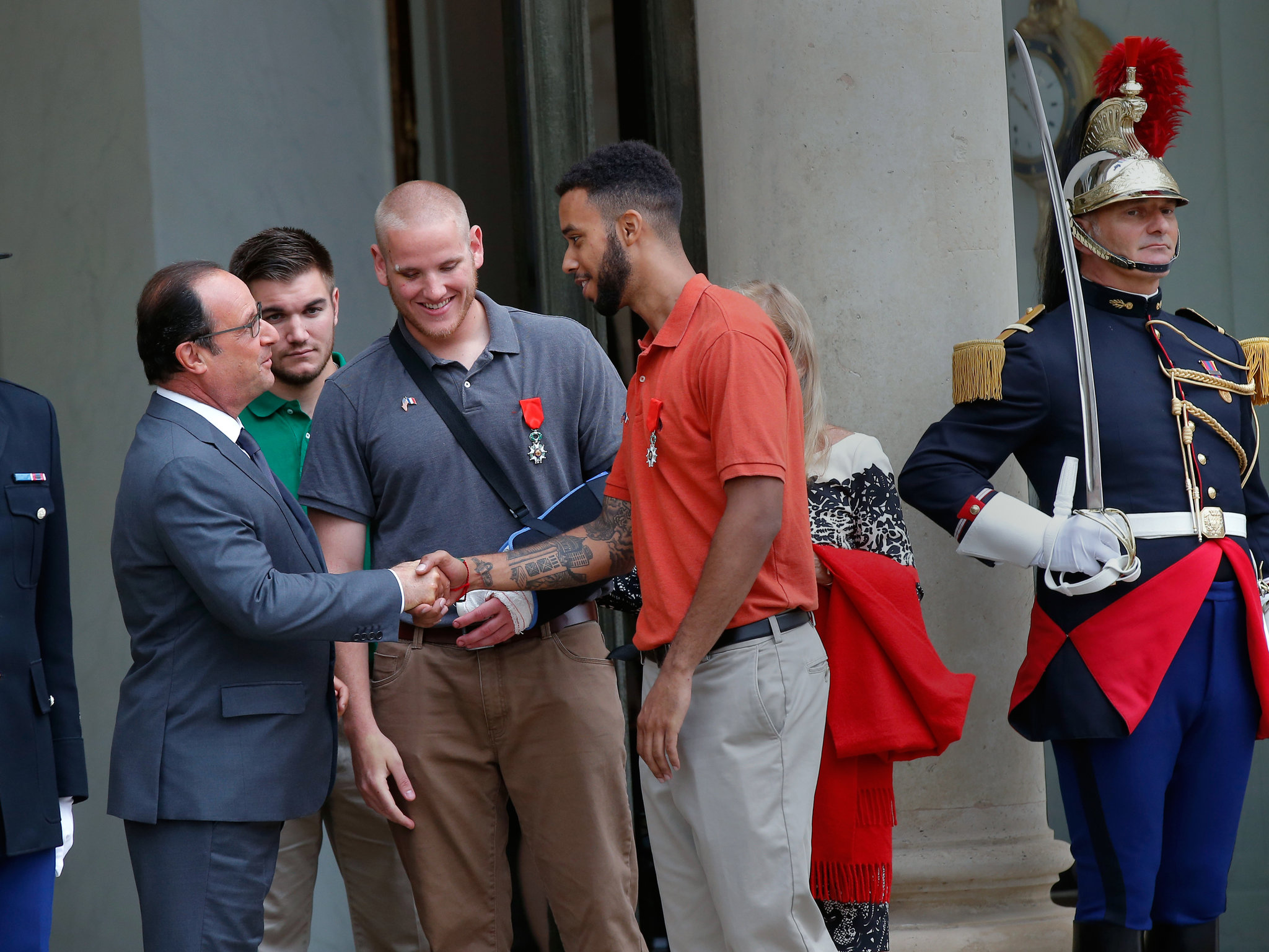 After his speech, Mr. Hollande pinned the Legion of Honor medal on the three Americans, who wore khaki slacks and polo shirts, bringing a casual touch to the ornate ceremony. Airman Stone, whose thumb was severely cut by the gunman, still had his left arm in a sling as well as a bruised eye.