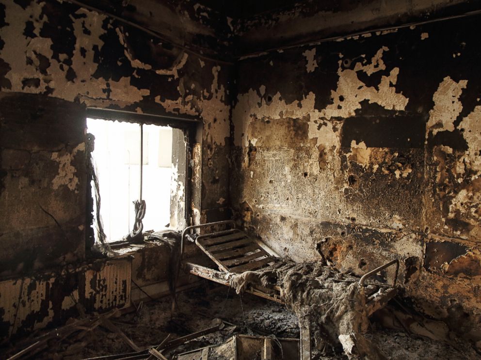 The photos show the hospital in ruin. Medical equipment and furniture charred by fire are thrown about the rooms and hallways. Parts of the walls have crumpled and much of the ceiling is destroyed.